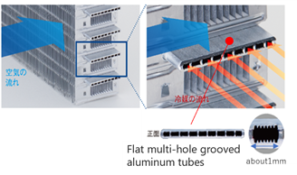 Compared to conventional cross fin heat exchangers, it weighs less due to its all-aluminum construction, provides higher performance by its smaller tube size, and reduces the amount of refrigerant, a cause of global warming, in addition to reduced size.