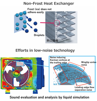 Market needs for low noise are extremely high, particularly in Europe. This is why we are developing technologies to reduce blower noise from fans and other components by identifying the source of the noise through fluid simulation and analyzing airflow around the fan to optimize fan shape to suppress vortex generation, a cause of noise.