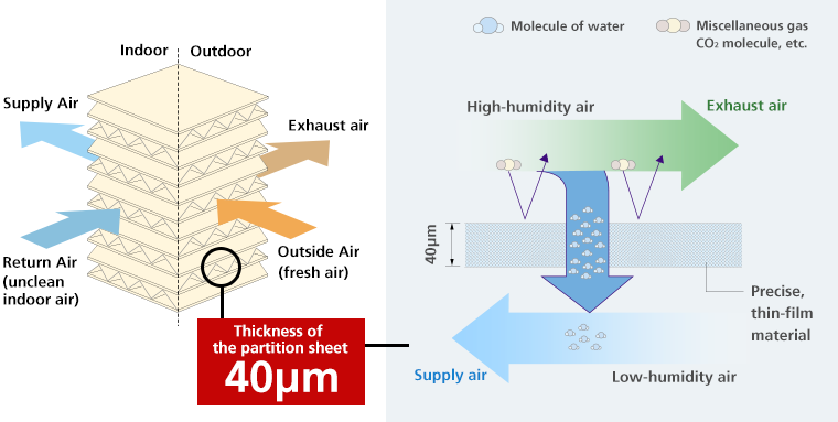 Daikin achieved its industry-leading level of enthalpy exchange efficiency by improving moisture permeability in making the thin film material even thinner to 40μm and adopting an element structure aimed at further improving the heat transfer area.